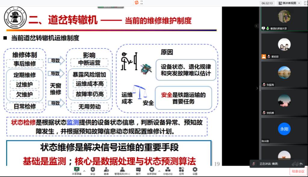 报告中,曹源分析了目前状态监测系统在转辙机故障诊断中的局限性,全面、系统地介绍了智能运维算法在转辙机故障诊断中的研究现状及应用前景,针对道岔转辙机智能运维中亟待解决的技术及应用问题,提出了多项传感监测技术、诊断模型及寿命预测算法等解决方案,详细分析了在工程实验中取得的效果。