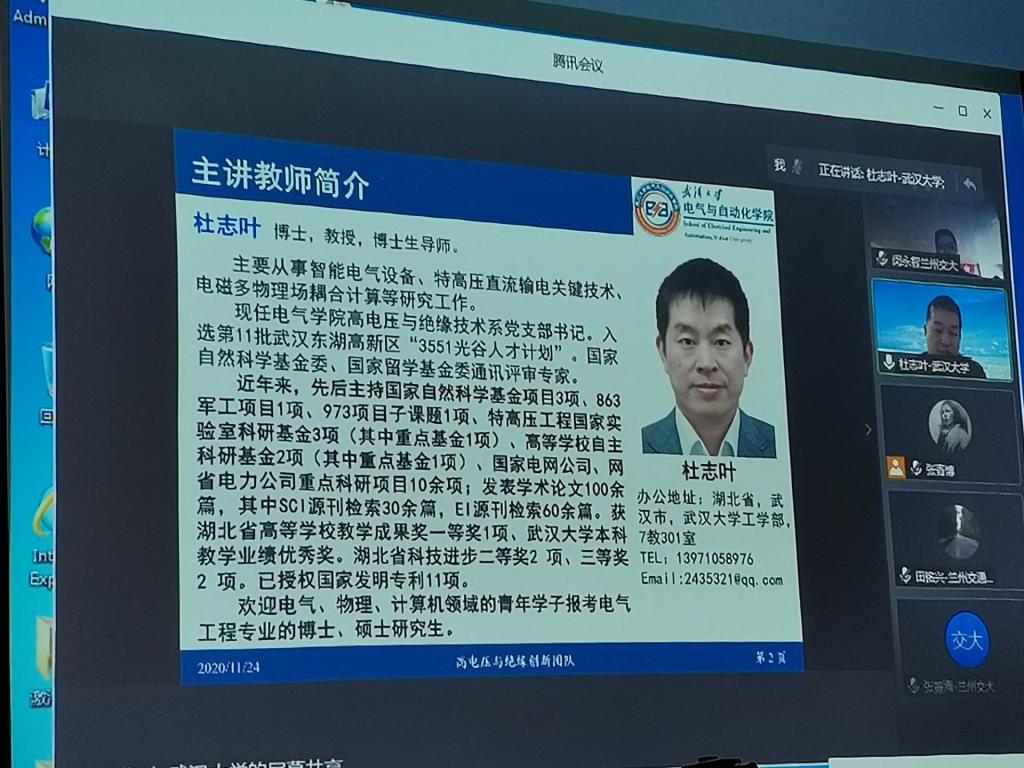 11月24日上午,武汉大学杜志叶教授在我院704会议室通过在线的形式做了题为《超(特)高压输变电工程电磁环境》的学术报告。学院教工及19级电气工程学科研究生等90余人参加了此次报告会。报告会由学院副院长张振海主持。