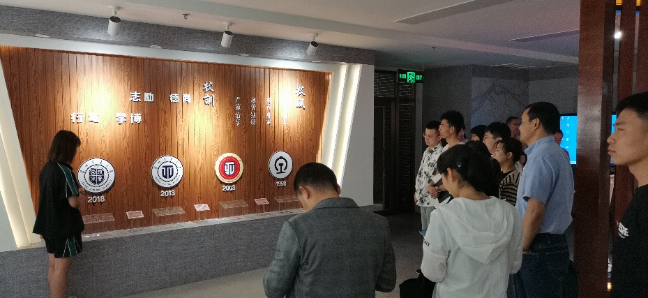 进入馆内,讲解员详细介绍了兰州交通大学校徽经历4次发展演变,截至目前校徽标志整体呈圆形,由内向外主要由"盾"造型、"齿轮"和"中英文校名"组成。重点突出学校的"铁路特色"和"工科优势",通过铁路符号和工科符号表现,"盾"的造型源自学校最近两次校徽均使用的典型元素,也和西南交大校徽的"盾"造型基本一致,一方面是原有校徽的延续性设计,另一方面蕴含了同西南交大之间的"相同血缘"关系。图中齿轮上60个齿的造型表示一甲子之意。白蓝色相互交映的主色调体现出交大学子孜孜不倦的学习精神。