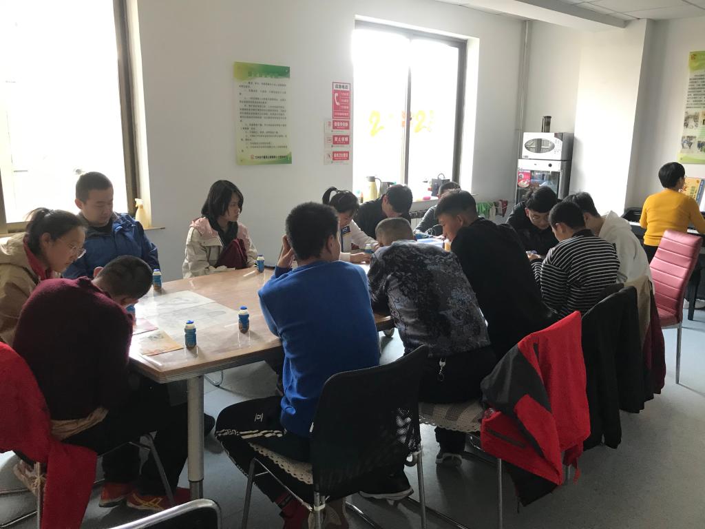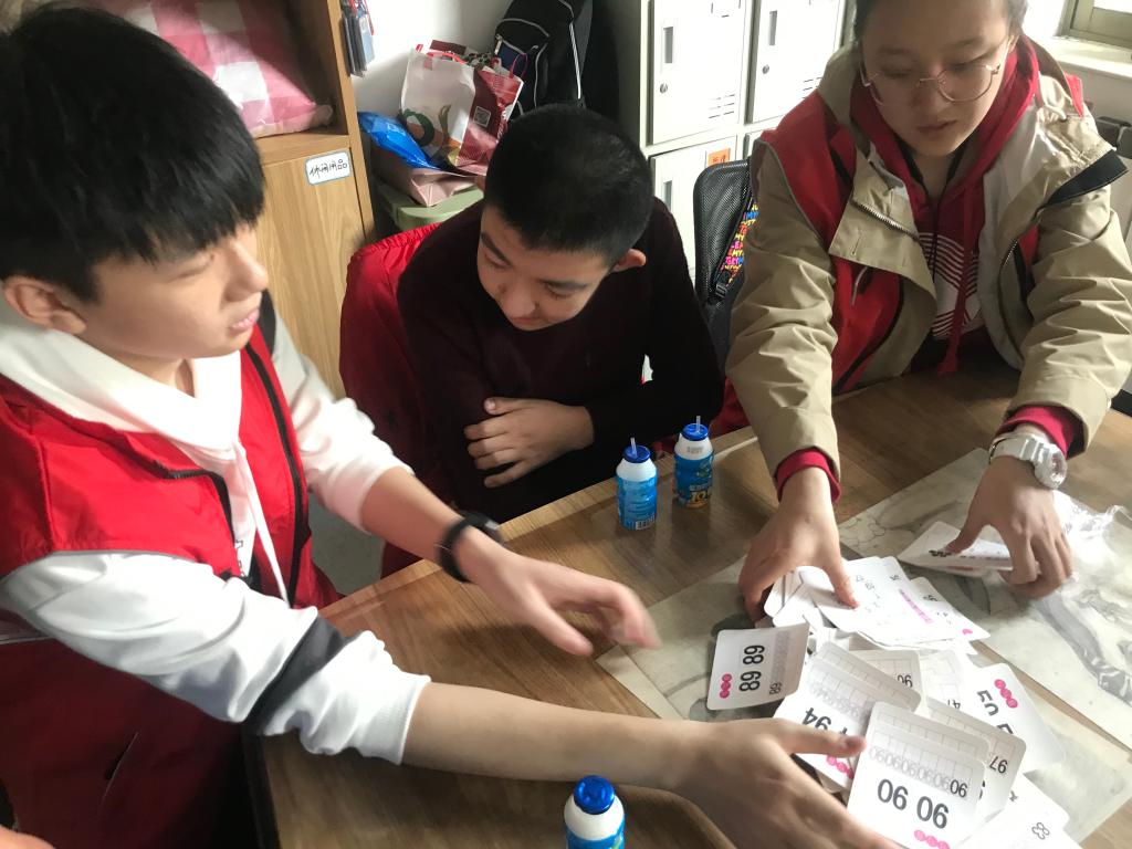 活动伊始,当志愿者们走进教室,看到这群特殊的孩子,听到他们咿咿呀呀的不太流利的话语,瞬间激起了想要关爱和帮助他们的心。大家采取一对一好朋友结对的形式,用真诚的笑容与孩子们沟通,通过游戏、互动与智障儿童耐心交流,认真地指导他们,很快打破了相互交往间的疏远,有的志愿者教他们唱歌,有的教他们串珠子来做艺术品,有的教他们识卡片……,大家积极奉献爱心,为这些特殊青少年们带去快乐和温暖。