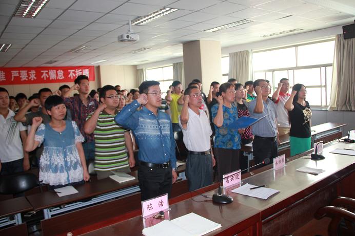 伴随着雄壮的国歌,大会拉开了帷幕。全体师生共唱国歌,烘托了会场的气氛。随后,在学院党委组织员常士香老师的带领下,全体党员举起右手,面向党旗庄严宣誓,新党员第一次向党承诺,老党员再次重温党的誓言,声音铿锵有力,表达了新老党员对党的感情和忠诚。