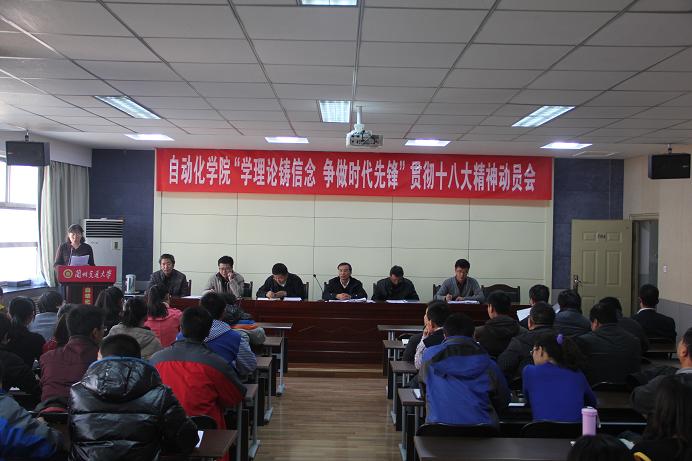 会上,学院院长、党委委员张友鹏教授传达了学校召开的各单位负责人会议关于学习贯彻十八大精神的要求。张院长围绕核心价值观、三个倡导、五位一体、新的四化和建设美好中国等方面进行了讲解,他强调:工业化、信息化、城镇化、农业自动化都与自动化息息相关,各党支部、各班要通过支部党员会、班会认真组织学习十八大精神,领会实质,学习活动要与学院工作实际相结合,抓住契机,建设美好学院。