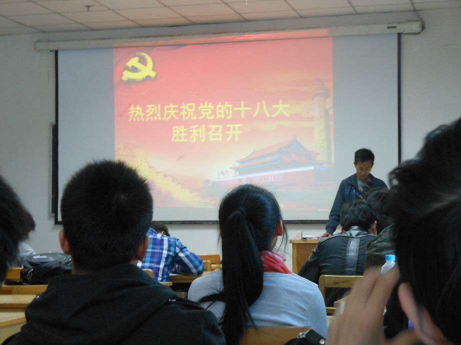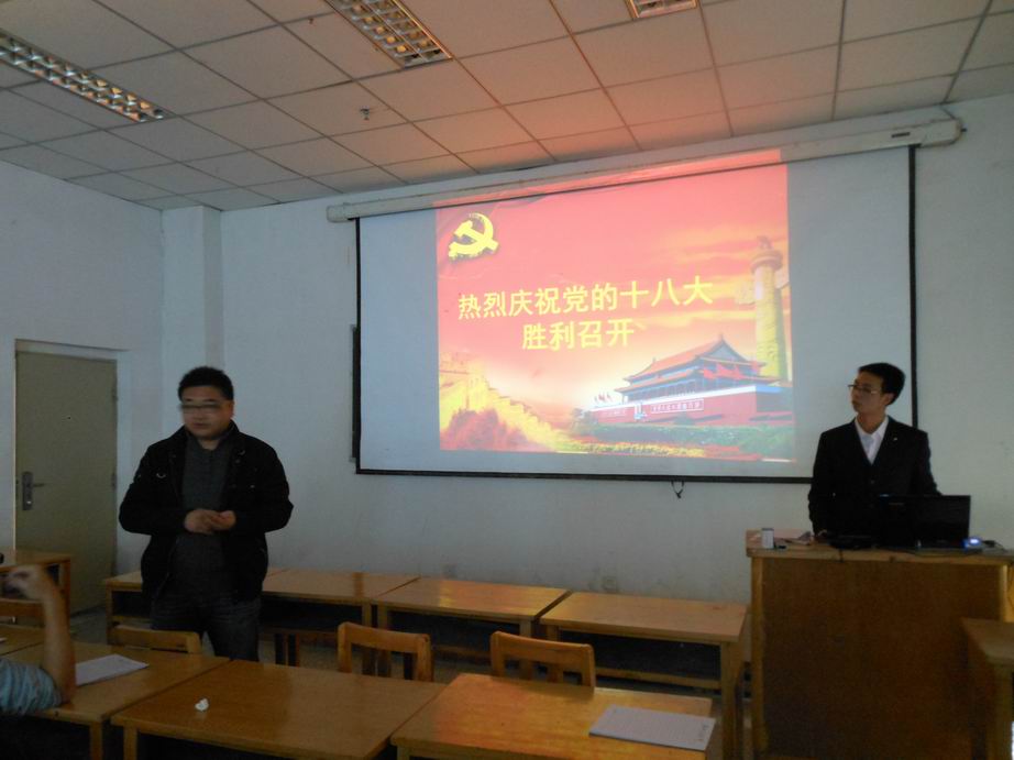 首先,所有党员学习了十八大的议题。尤其针对胡锦涛总书记在十八大开幕式上做的《坚定不移沿着中国特色社会主义道路前进,为全面建成小康社会而奋斗》报告中的教育、就业、党建等问题做了认真的思考和谈论。然后,几名学生党员就“全面建设小康社会”、“加快医疗卫生服务建设,提高人民健康水平”和“贪污腐败”等热点问题发表了自己的看法。最后,石磊老师强调了学生党员要认真学习和领会十八大精神,努力学习,掌握扎实的专业知识,积极参加各项活动,达到全面发展。