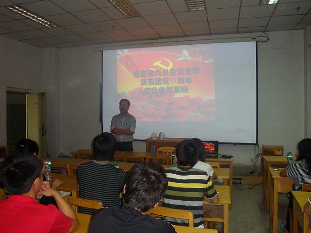 为纪念党的九十一华诞,回顾党的光辉历程,自动化学院自控第六学生党支部于近日组织全体党员观看《建党伟业》、《风声》等红色影片,让全体党员感受红色经典的力量,感怀赤诚中国的精神。活动开始前,党支部书记陈浩老师向全体党员介绍了活动的意义,并传达学校创先争优表彰总结大会的精神,同时对近期支部工作进行了安排部署。