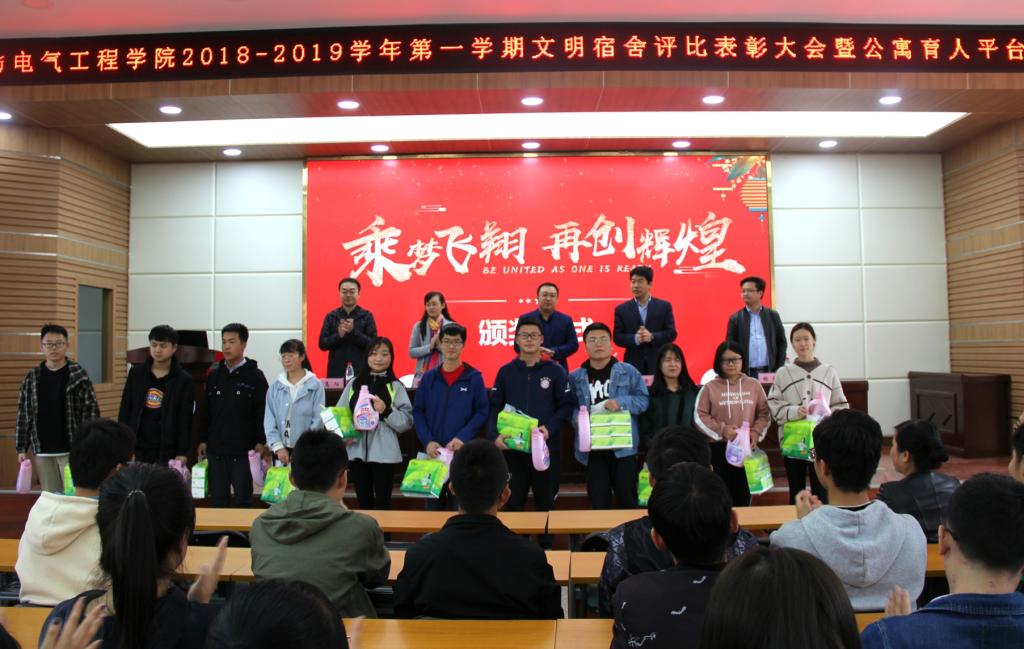 会上,学院学工办主任杨栋老师首先宣读了《自动化与电气工程学院关于2018-2019学年第一学期文明宿舍的表彰决定》,鼓励大家积极营造“学有榜样、赶有目标、超有动力”的宿舍氛围。 接着举行了颁奖仪式,与会各位老师为文明宿舍成员代表颁发了奖品。