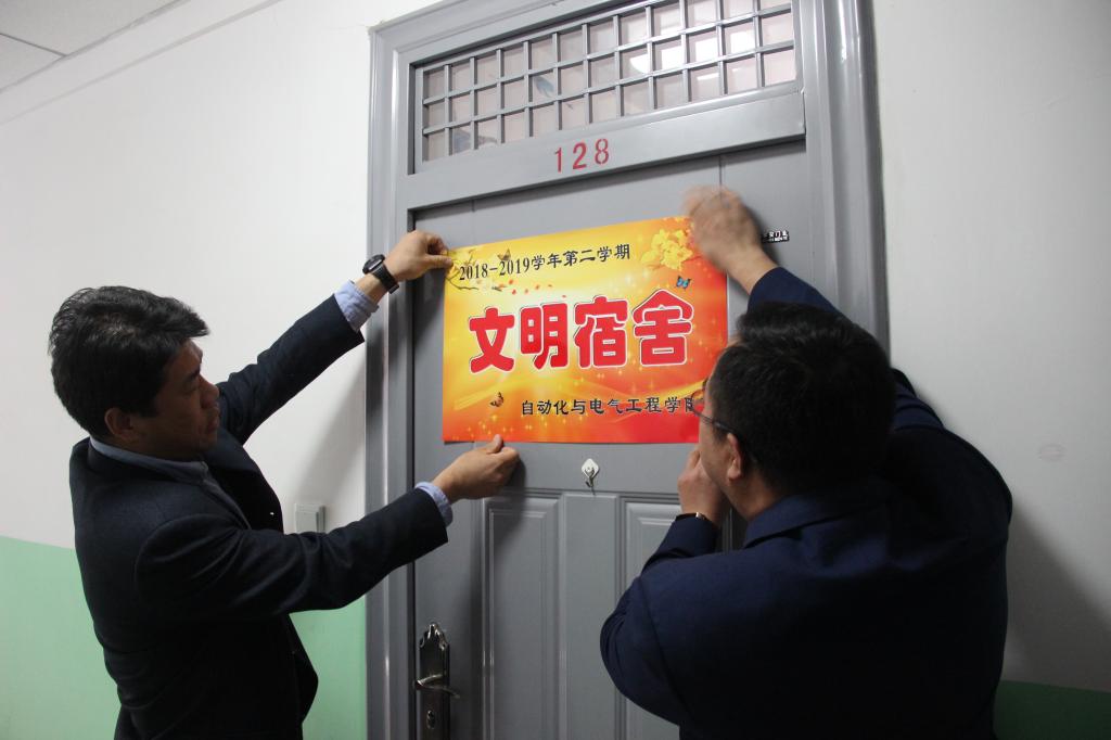 推进会后,与会老师来到校内5公寓,为受到表彰的文明宿舍挂牌。