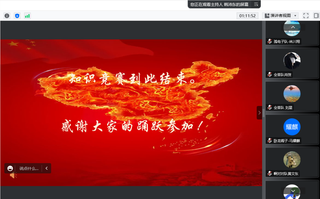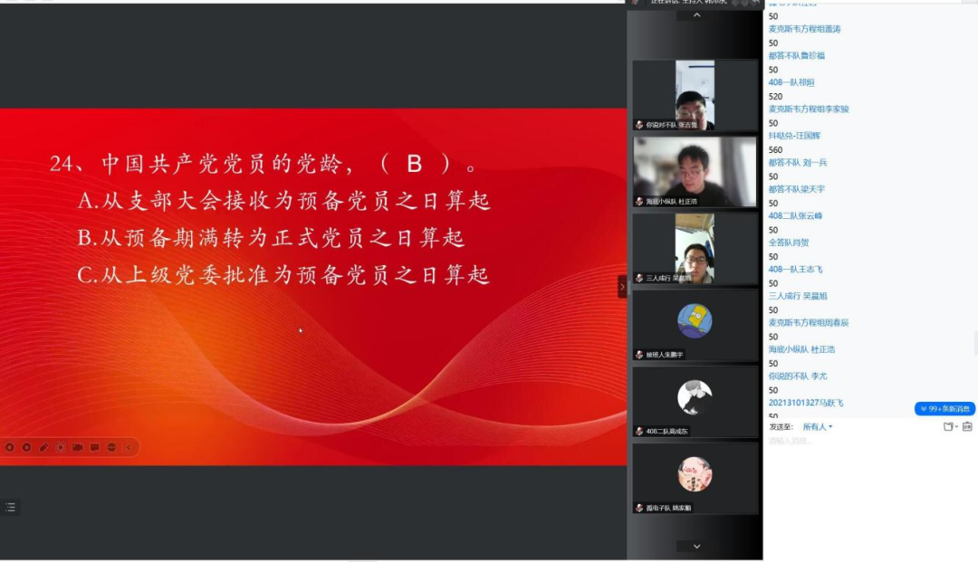活动伊始,由主持人介绍相关规则以及对参赛人员的相关要求,本次比赛采用抢答的方式来进行。同学们全神贯注积极抢答问题,各队参赛人员自信满满的回答,配上充满红色气息的PPT,都别有一番风味。随着比赛的进行我们看到408队与麦克斯韦方程队积分在不断的增加,排名落后的队伍亦不甘放弃,积极应对之后的问题。“喜迎二十大,奋进新征程。”同学们满怀热情与激情来完成本次比赛。“江山代有才人出,各领风骚数百年。”青年一代的我们是国家富强与繁荣的中坚力量,本次比赛让我们看到我院青年学子自强不息,积极进取的精神。我们应当奋发图强,砥砺前行,不负韶光,不负时代,用青春书写新时代中华青年的人生篇章。