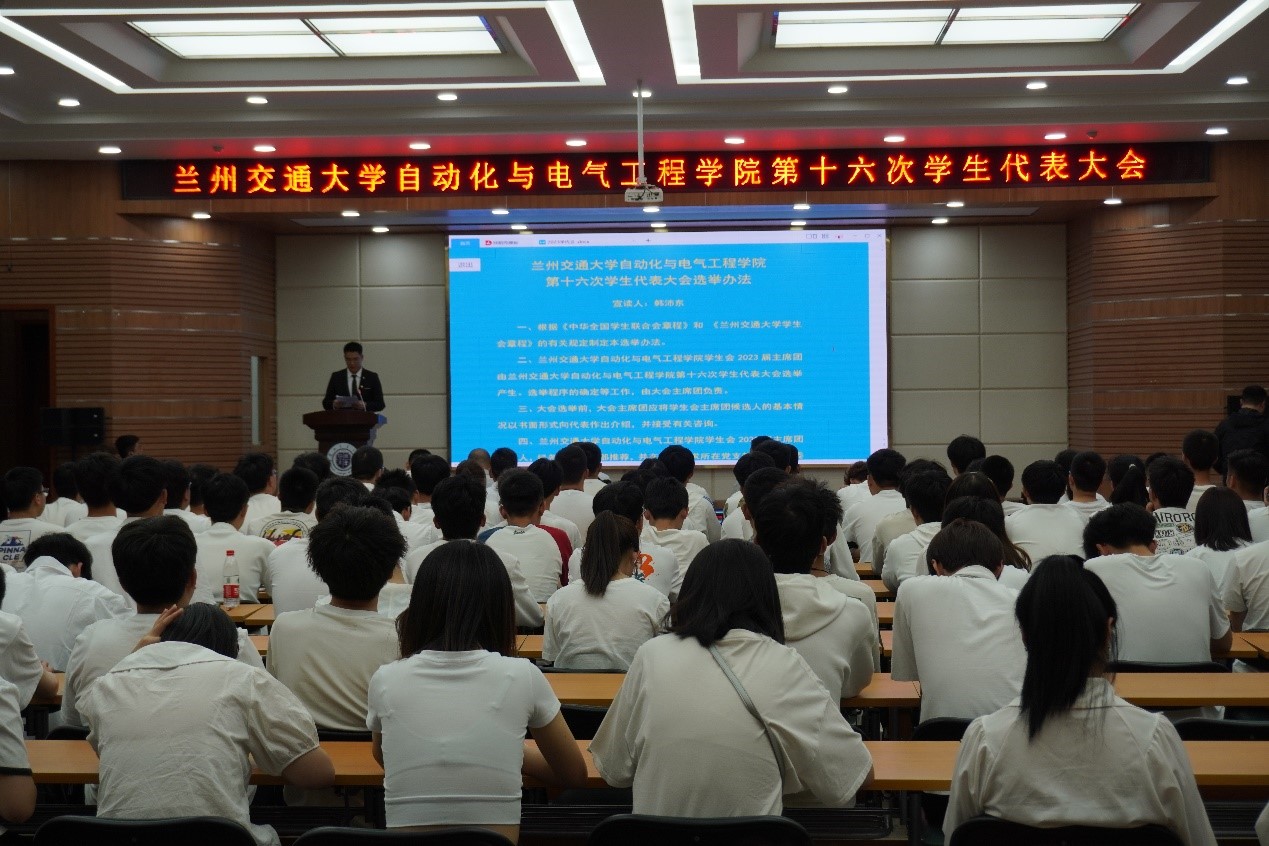 2023年5月17日,兰州交通大学自动化与电气工程学院第十六次学生代表大会在二教报告厅顺利召开。学院党委书记李小平老师,学院党委副书记、副院长陈浩老师,校团委负责老师,学院张江涛老师、赵威老师以及103名学生代表参加本次大会。