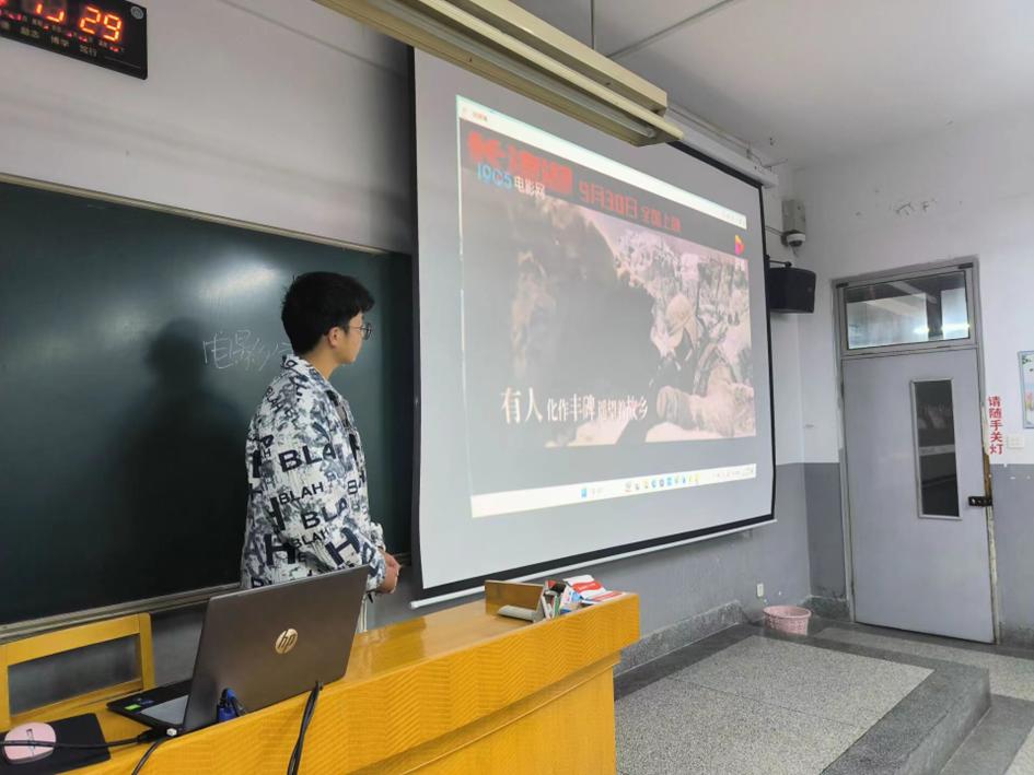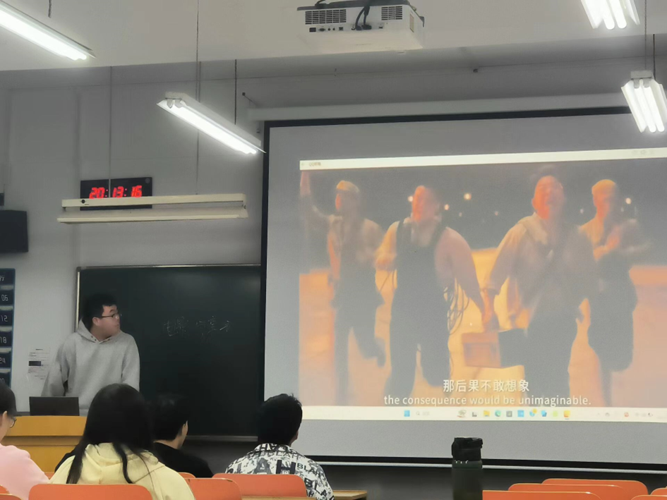 活动在主持人简洁的开场白中拉开了帷幕,首先,由每位选手对自己喜爱的电影进行讲述,每一位选手的分享都使观众对所分享的电影产生了极大的好奇和情感共鸣。其中《长津湖》的分享,王振同学慷慨激昂地讲述电影中抗美援朝的激烈场面以及我军的英勇骁战,观众随着电影片段的播放思绪激荡,爱国情怀荡漾在每一个人心中;而在电影《肖申克的救赎》分享中,随着选手的娓娓道来,主人公悲惨却又不失热烈的经历深深烙印在了每一位观众心中,现场掌声连连。在热闹的氛围中活动进入了第二部分,由工作人员为选手及观众播放精彩的电影桥段,同学们都全神贯注地欣赏,不自觉的和电影中的主人公产生情感上的共鸣。随着时间的推移,活动渐入尾声,由主持人对所播电影及其所体现的意义进行了简短的总结。
