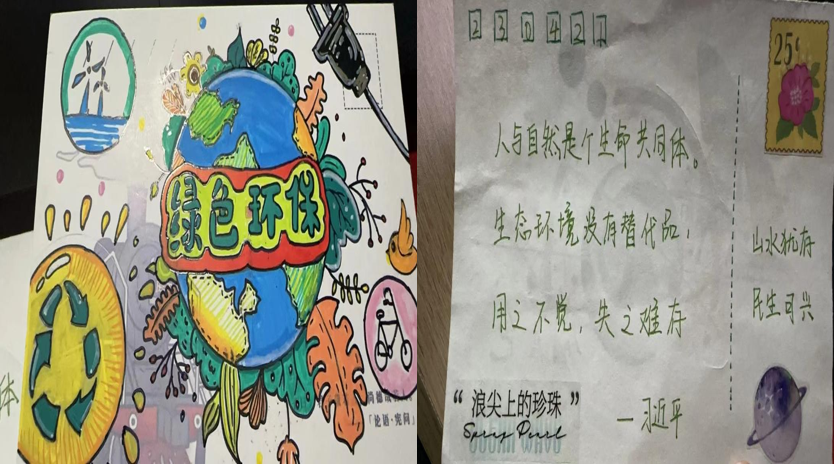 本次活动以制作践行环保的标语,拍摄有关环保知识的讲解视频,和清扫卫生的垃圾的视频形式开展,同时每位值班人员都细心为参与活动的同学讲解环保知识。我院同学积极响应绿色环保的号召并踊跃参加本次活动。其中田乐然同学制作的明信片图文并茂,并引用了习近平总书记的话:“人与自然是个生命共同体,生态环境没有替代品,用之不觉,失之难存”,引起同学们思考:保持美丽的环境是何其困难!我们须加倍努力,从自我做起,一屋不扫何以扫天下!为了干净的明天,我们每个人都要出一份力!所有的参与人员纷纷表示,通过本次活动,同学们了解到了很多有关垃圾分类、绿色环保的知识,明白了绿色出行的重要性,还学到了许多实用的环保方法,为环保事业积蓄自己的力量。