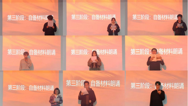 大赛对选手展开全方位考察,既注重语言规范的精准度与情感表达的感染力,也考验临场应变的敏捷性与综合素养的全面性。比赛共设四个环节:在自我展示中,选手以鲜明个性亮出真我风采;在语音基本功考核中,他们字正腔圆,展现扎实功底;主题朗诵环节,大家紧扣核心、以情传声,赋予文字鲜活的生命力;而到了即兴发挥环节,面对随机命题,选手沉着思考、快速破题,以流畅的表达与独到的见解尽显应变智慧。整场比赛进程紧凑有序,高潮迭起、精彩纷呈。选手们的出色表现不断点燃现场气氛,赢得观众一波接一波的热烈掌声,喝彩与赞叹此起彼伏。