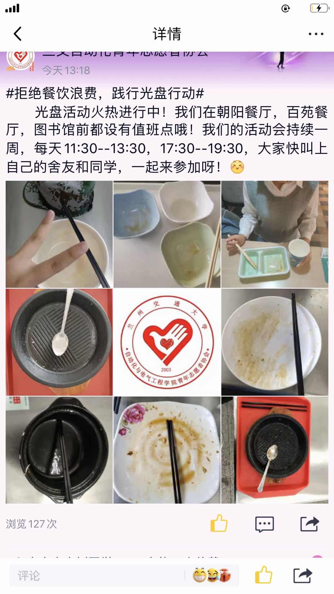为大力弘扬勤俭节约精神,倡导文明用餐、拒绝浪费,自9月22日起,自动化学院青年志愿者协会通过校内食堂和网络媒体等平台开展“拒绝餐饮浪费,践行光盘行动”宣传活动。
