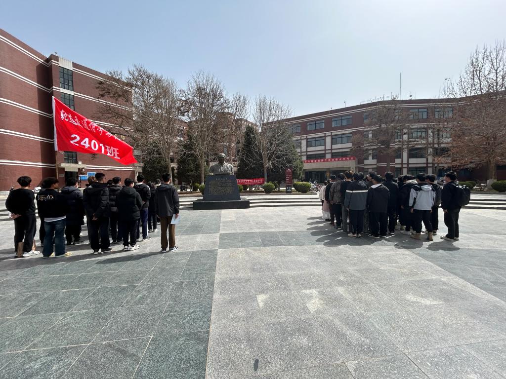 活动伊始,学生代表结合珍贵史料,系统讲述茅以升主持修建钱塘江大桥的传奇历程。从克服80余年技术封锁首创“沉箱法”,到抗战时期为阻敌炸桥、战后抢通浙赣动脉的壮举,生动诠释“工程报国”的使命担当。随后,全体同学列队向茅以升雕像致敬,并由学生代表向茅以升先生雕像敬献白菊,寄托对先贤的深切追思。最后,辅导员老师寄语:“让我们以今日为起点,将‘茅以升精神’化作课堂中的专注、困境下的坚韧、赛场上的拼搏,在铁路高质量发展的时代中写下属于这一代人的答案。”