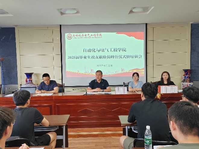 为进一步做好校友培训工作,搭建毕业生与学院间稳固的沟通桥梁,6月11日下午,自动化学院在704会议室举行了2025届毕业生校友联络员聘任仪式暨培训会议。学院党委副书记、副院长陈浩,学院团委书记张宏雁,学院学生工作办公室主任马腾,辅导员宋国庆、蒙平珠及2025届本科毕业班校友联络员参加了会议。会议由辅导员蒙平珠主持。