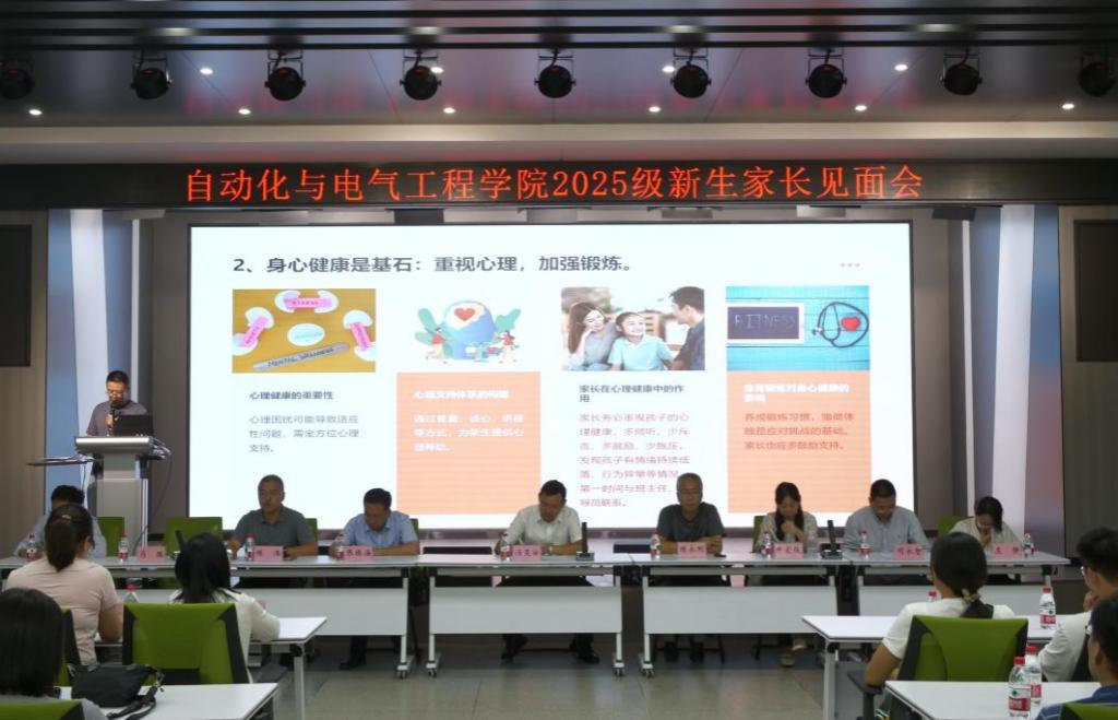 为搭建家校沟通平台,促进双方深入交流,形成育人合力,共同助力新生尽快适应大学生活、实现全面成长。自动化与电气工程学院于8月30日晚在五教萃英厅隆重举行了2025级新生家长见面会。会议由学院学生工作办公室主任马腾主持,学院领导班子全体成员、各系(室)负责人、2025级辅导员和班主任以及新生家长共计400余人共同参加,围绕学生成长与发展开展深入交流,共筑家校协同育人桥梁。