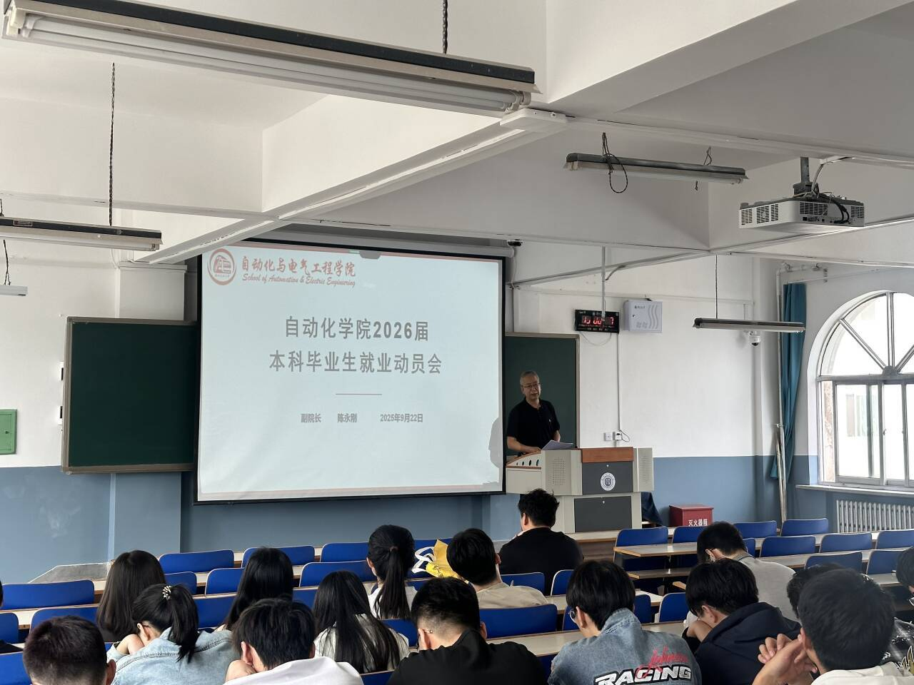 为全面推进2022级毕业生就业工作,帮助毕业生认清就业形势、明确职业方向,2025年9月19日至9月23日,自动化学院领导班子成员分批次深入联系班级,围绕就业形势与政策解读、考研形势分析、职业规划指导等主题开展系列就业动员会,为毕业生送上“就业冲刺阶段”的暖心指导。