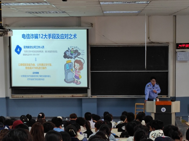 讲座中,沙警官紧密结合大学生日常生活场景,重点讲解了校园贷诈骗、兼职刷单返利、游戏账号虚假交易等新生群体易遭遇的诈骗类型。他通过真实案例,深入剖析了“AI换脸冒充亲友借款”、“低价网购诱导转账”等新型诈骗手法,并系统传授“未知链接不点击、陌生来电不轻信、个人信息不透露、转账汇款多核实”的“三不一多”防骗原则。沙警官还详细说明了遭遇诈骗后的正确处置流程,包括第一时间拨打110报警、就近前往派出所报案,以及妥善保存聊天记录、转账凭证等关键证据。