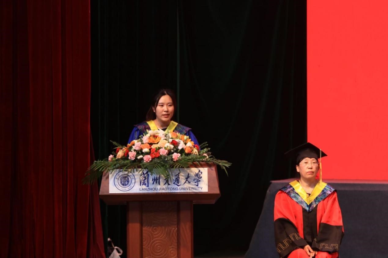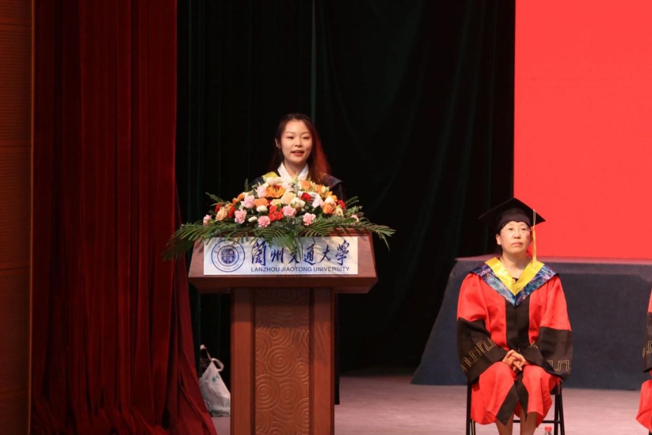 研究生代表何永贞同学回顾了研究生三年的学习生活,向辛勤培育自己的老师表示衷心的感谢并祝愿母校再创辉煌,她号召同学们继续保持坚韧不拔、奋发向上的精神状态,时刻保持学习进取,时刻保持谦虚谨慎,矢志爱国奋斗,让青春之花绽放在祖国最需要的地方。