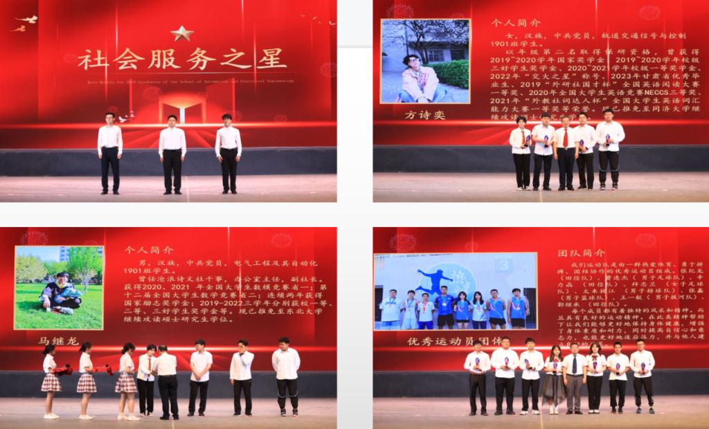 随后,副校长党建武、陈光武和学院领导分别为2023年毕业生榜样人物——“求知善读之星”、“创新表率之星”、“青春志愿之星”、“社会服务之星”、“榜样团队”的获奖代表颁奖,用“榜样的力量”引领学院青年学生扬帆新征程,建功新时代。