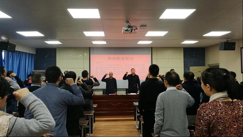 作为一个重要环节,由省级教学名师武晓春老师,带领全体教工进行教师职业誓词宣誓,通过宣誓活动,进一步坚定教师职业信念和职业操守,深刻理解教师职业责任和义务,增强教师职业幸福感、荣誉感。