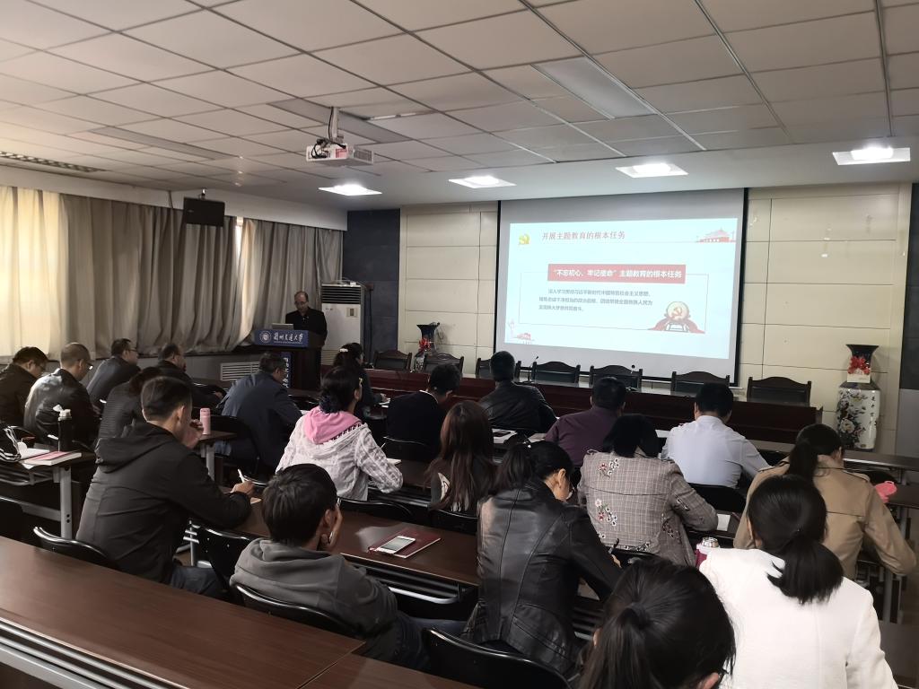 陈院长首先从入党誓词入手,重申了党员的权利和义务,强调了是中国共产党人的初心和使命和“不忘初心、牢记使命”主题教育的重要意义。然后介绍了主题教育的范围、开展主题教育的根本任务、总要求、具体目标以及主题教育的特点。陈院长强调,全体教工党员要增强“四个意识”、坚定“四个自信”、做到“两个维护”,同时也要清楚的了解和拥护“五位一体”总体布局、“四个全面”战略布局以及“五大发展理念”,并用于指导工作。