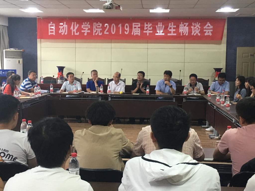 为全面落实高校立德树人根本任务、三全育人工作机制,对标工程教育认证持续改进要求,进一步提升本科生培养教育质量,创新人才培养模式,6月18日下午4点,自动化学院在704会议室召开2019届毕业生畅谈会,征求毕业生对学院各项工作的意见与建议,进一步完善学院的管理制度,提升服务育人水平。学院领导班子全体成员、各系(室)主任、学生工作人员及毕业生代表90余人参加畅谈会。会议由学院党委副书记、副院长姜滨主持。