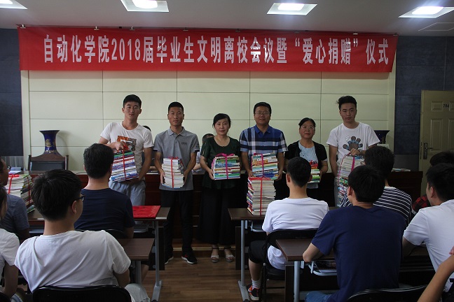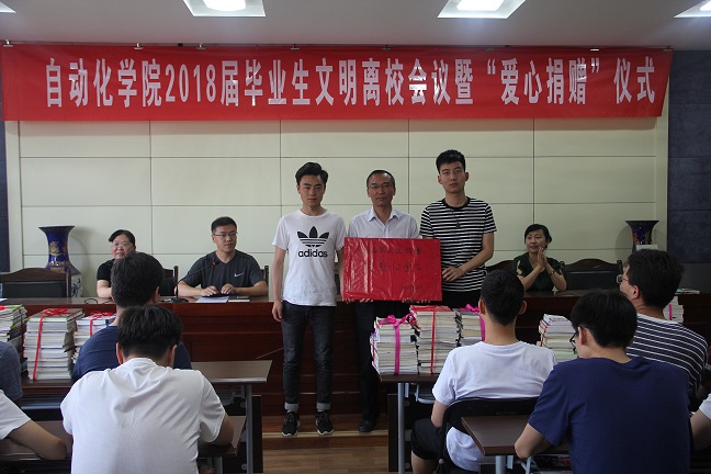 2018届毕业生即将完成在校的各项学习任务,踏上自己的新征程。为确保毕业生文明、安全、顺利离校,6月21日上午10:30,自动化学院在学院704会议室召开了学院2018届毕业生文明离校会议暨“爱心捐赠”仪式。学院党委书记米根锁,副书记、副院长高云波,2014级辅导员以及2018届毕业班学生干部参加了会议。会议由学院学生工作办公室主任陈浩主持。