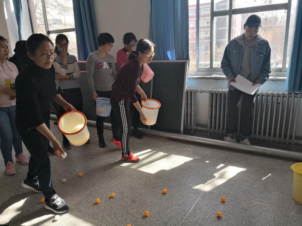 比赛现场气氛热烈而欢快---女教工个个精神抖擞,认真比赛;男教工热情参与,观战助威。