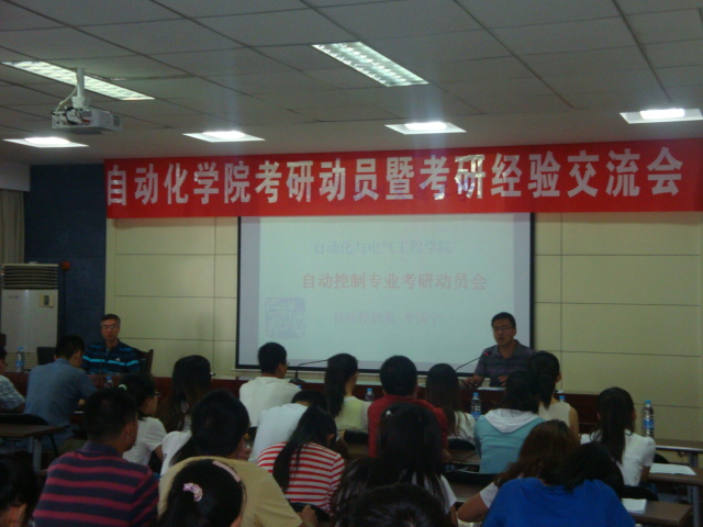 交流会上自动控制系主任李国宁老师首先结合学院本专业近几年的考研率,考研后的就业去向,详细分析了研究生教育的优势。他从考研的目的、考研的准备、考研的途径、考研的政策等方面向同学们一一做了详细的介绍。并鼓励同学们要持之以恒,克服困难,做好充分的准备,争取优异的成绩,实现自己心中的考研目标。